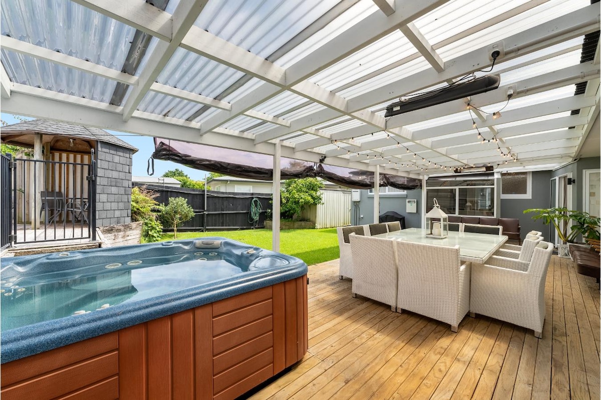 SUMMER COASTAL PARADISE This beautiful, stylish bach has everything you need. Wrap around decks with views to the Mount, a luxury 6-seater spa, brand new comfy beds and all the mod cons. Travelling for work, or leisure your hosts will ensure you have all you need to relax and make the most of this stunning new build and its fantastic location. 5 minute stroll to the beautiful Omanu beach or a 5 minute drive to the boutiques and restaurants of Mount Maunganui.