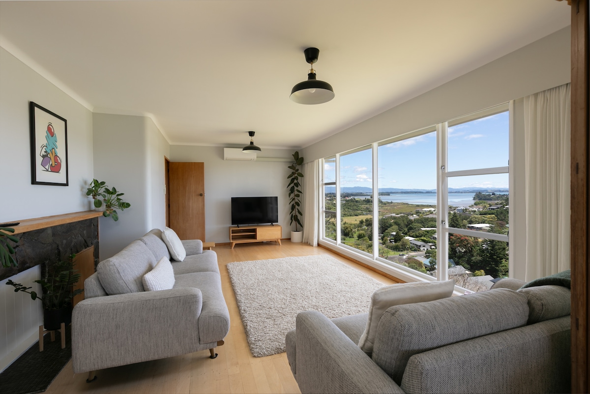 It’s rare to find a space with views of both Mauao / Mount Maunganui and farmland with horses, all while being centrally located — perfect for a work stay or weekend getaway. Bright and cheerful, with homely décor and plenty of plants, the space feels relaxed and welcoming. Bayfair Shopping Centre is nearby, the beach is just down the road, and cafés close by will satisfy your coffee cravings.