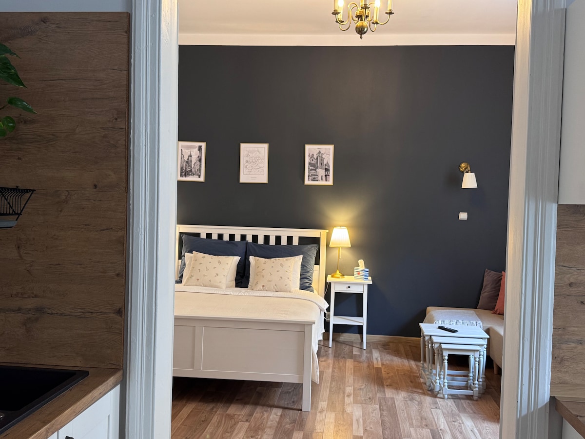 Stylowy, jedyny w swoim rodzaju apartament w samym sercu krakowskiego Kazimierza z pięknym widokiem na Plac Wolnica. Wnętrze łączy elegancję, historię i artystyczny charakter, doceniony przez magazyn Elle Decoration. Duże, wygodne łóżko z wysokiej jakości materacem zapewnia doskonały wypoczynek, a urokliwy, retro stół przy oknie to idealne miejsce na śniadanie lub pracę. Współpracujemy z lokalnymi przewodnikami, oferując wycieczki do Auschwitz, Kopalni Soli w Wieliczce oraz zwiedzanie miasta.