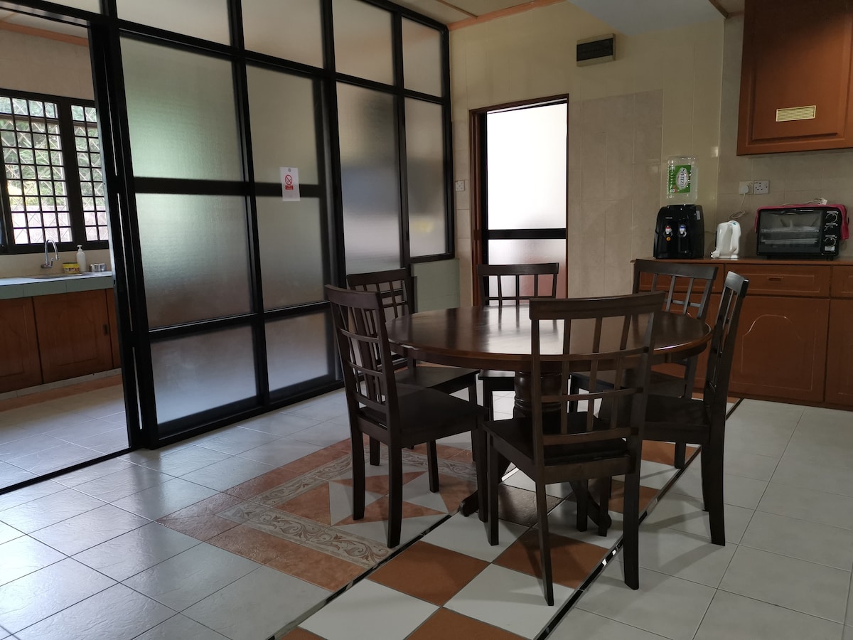 A cosy, simple, spacious and minimalist design corner lot house which can accommodate up to 10 people. There are 4 fully air-conditioning bedrooms, either Queen-size or Single-size mattress. 3 of the rooms are equipped with ceiling fan too! Common areas : dining room, living room, dry kitchen, shared bathroom and car park in the premise are available in our home. Big parking space :can keep up to 5 vehicles. Welcome to Nuwatel and forget your worries in this spacious and serene space!