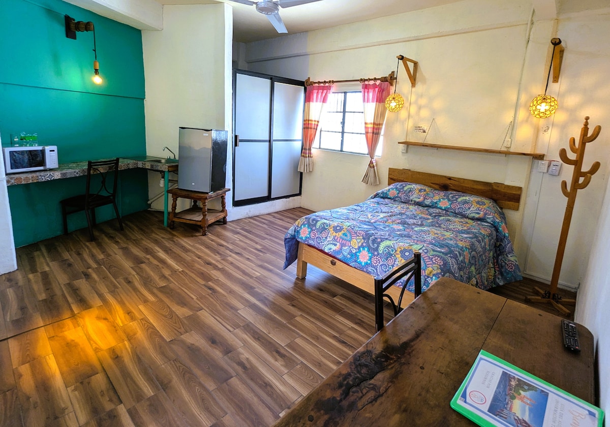 Habitación con muebles rústicos, acogedora, con buena iluminación natural, abordo de calle, con entrada exclusiva, a 3 min de la iglesia de Santa Prisca, y no tiene que caminar para tomar transporte público en caso de necesitarlo, ya que lo puede tomar desde la entrada de la habitación.