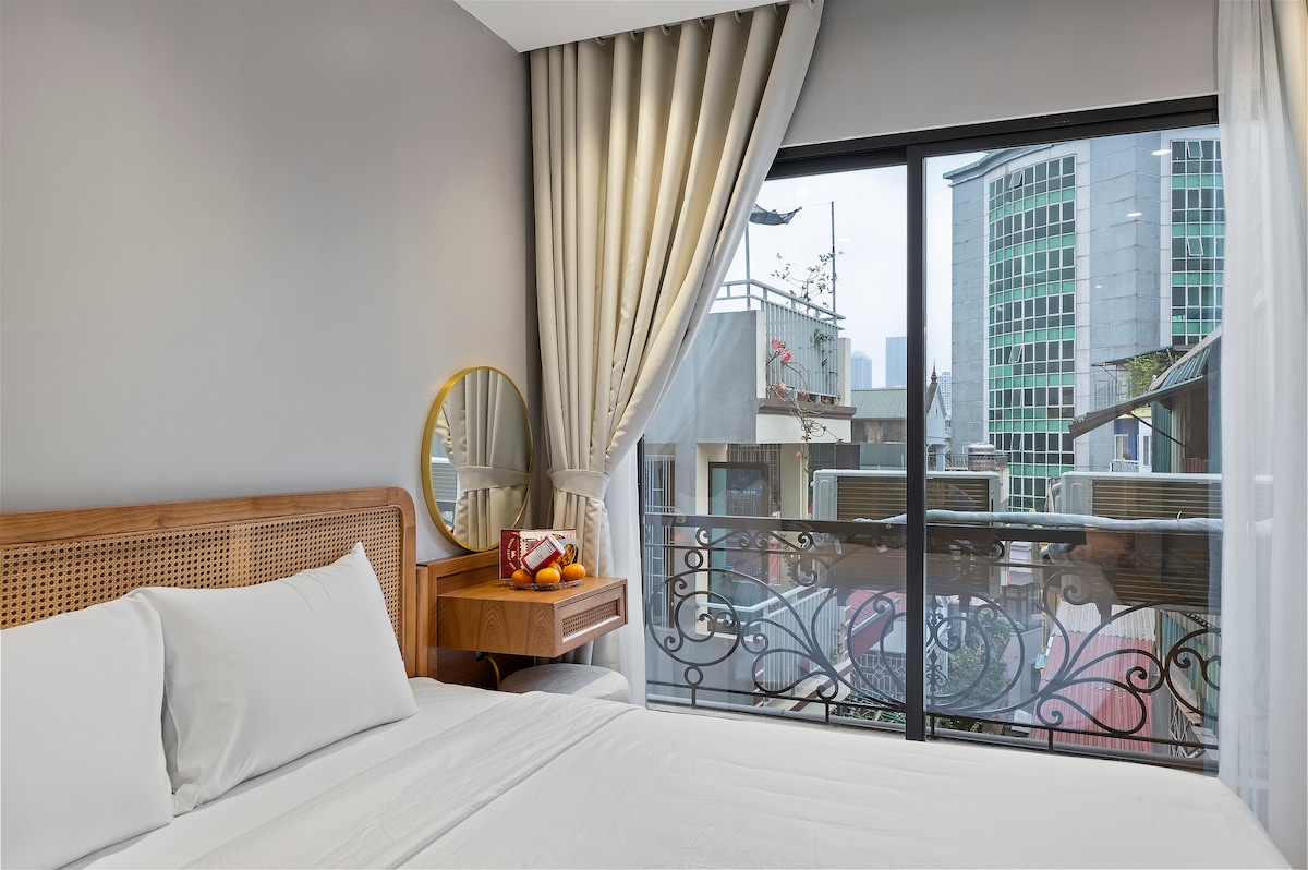 🌿 Junior Suite 43m² – Balcony & Bathtub | Central Hanoi 🏡 Details: Size: 43m², spacious design Bed: 1 king-size bed (1.8m x 2m) with a soft mattress Bathroom: a bathtub and standing shower, equipped with 5 sets of towels and 5 sets of personal amenities Amenities: Refrigerator, electric kettle, TV with Netflix, safe box, free drinking water, coffee, and tea Private Balcony: Airy with a city view ✨ Included Services: 🎈 Free breakfast 🎈 Free Swimming pool 🎈 Free basement parking