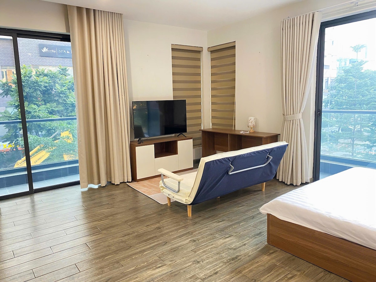 Phòng VIP 40m² mới 100% tại Ladino Home – 6th Element, Tây Hồ Tây. + Ô tô đỗ cửa, 2 ban công lớn thoáng sáng. + Có khu vui chơi trẻ em – khu thư giãn người lớn – vườn hoa xanh mát. + Full tiện nghi: giường êm, Smart TV, điều hòa, tủ lạnh, bếp, bàn làm việc, phòng tắm riêng. Máy giặt – máy sấy miễn phí tầng 5. + Vị trí thuận lợi: 10 phút tới Hồ Tây, 15 phút tới Lăng Bác, 30 phút sân bay; vài phút tới Ba Đình, Cầu Giấy, Nam/Bắc Từ Liêm. + Khóa vân tay, thang máy, cafe – nhà hàng – Winmart 20m.