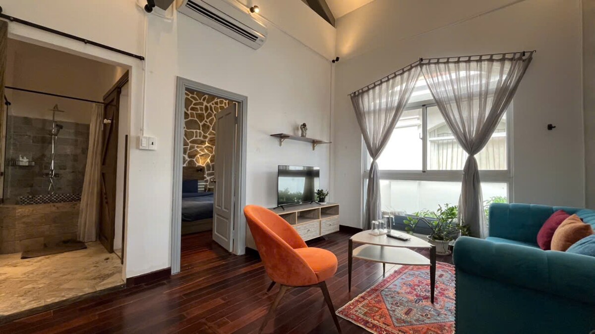 This is a ground floor separate entrance tiny loft house featuring a high ceiling, modern cement walls and floor. Central located in Phan Xich Long, foodie area in Phu Nhuan District, 10 mins from the airport and 15 mins from the train station. Close to both the historical District 1 and the trendy District 2. Complete privacy with its own entrance, fast wi-fi and strong Air Conditioner, suitable for moderate stay over a week long. Check in is 3pm, Check out is 1pm