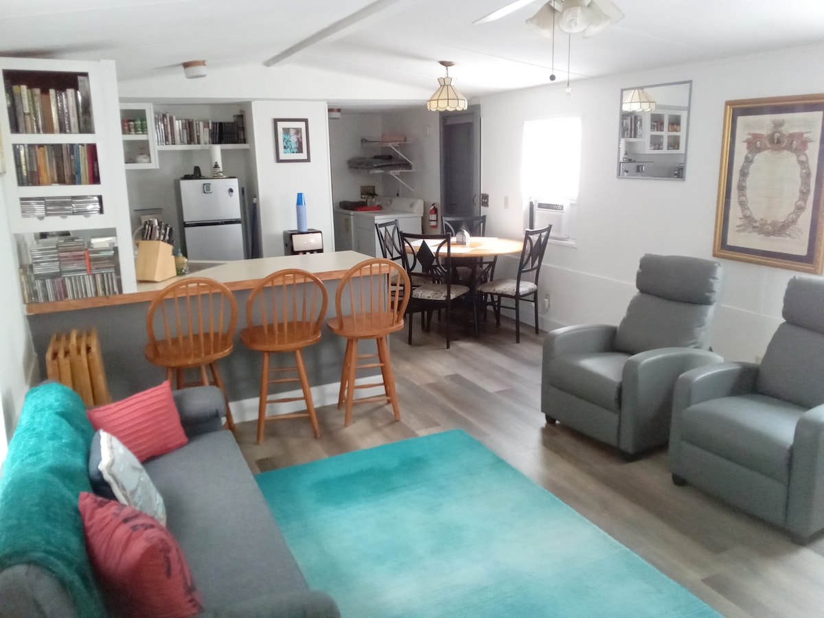 Furnished cottage with river view windows and a walk around deck. Open floor plan with king size bed and choice of either the full-size sleeper sofa or (2)comfy twin mattress beds . Enjoy relaxing and watch the river flow by from the swivel rocker recliner. Newly installed AC/Heating unit. Wall mounted swivel TV for easy viewing 200 channel Dish TV. Wi-Fi. The cottage is fully furnished, mini frig, microwave, toaster, coffee pot, dishware, bed and bath linens & basic cooking condiments.
