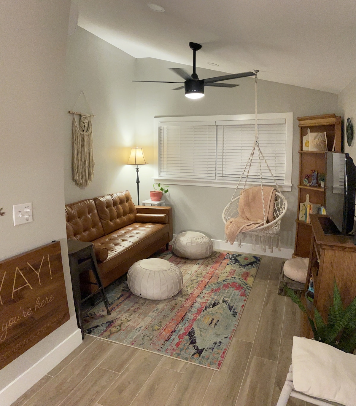 This new backyard guest house is on a tree-lined street. Full kitchen with gas range is perfect for weekend dinners or to stay longer. The decorative welcome sign folds up to a table for two. The living room is a perfect place to unwind with WiFi and AppleTV or an assortment of books. It is pet friendly and can accommodate kids on floor pallets, if needed. This house is in our family's backyard, but we make sure you have a private stay.