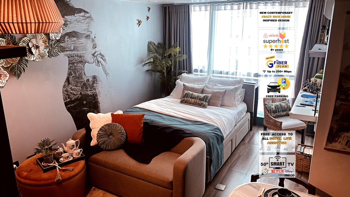 This stylish and unique place is inspired by Crazy Rich Asian interior. Situated in the heart of Bonifacio Global City, this brand new space brings a perfect experience to the country's premier lifestyle-business district. - Smart lock keyless self check-in - Smart TV with Max/HBO 50 inch 4k - Smart AC & Lights - Very Fast wifi 250 Mbps - quiet work station Guest access Swimming pool (Tue to Fri only) No Gym but gym in mall Parking Basketball & Badminton Courts (must be reserved a week prior)