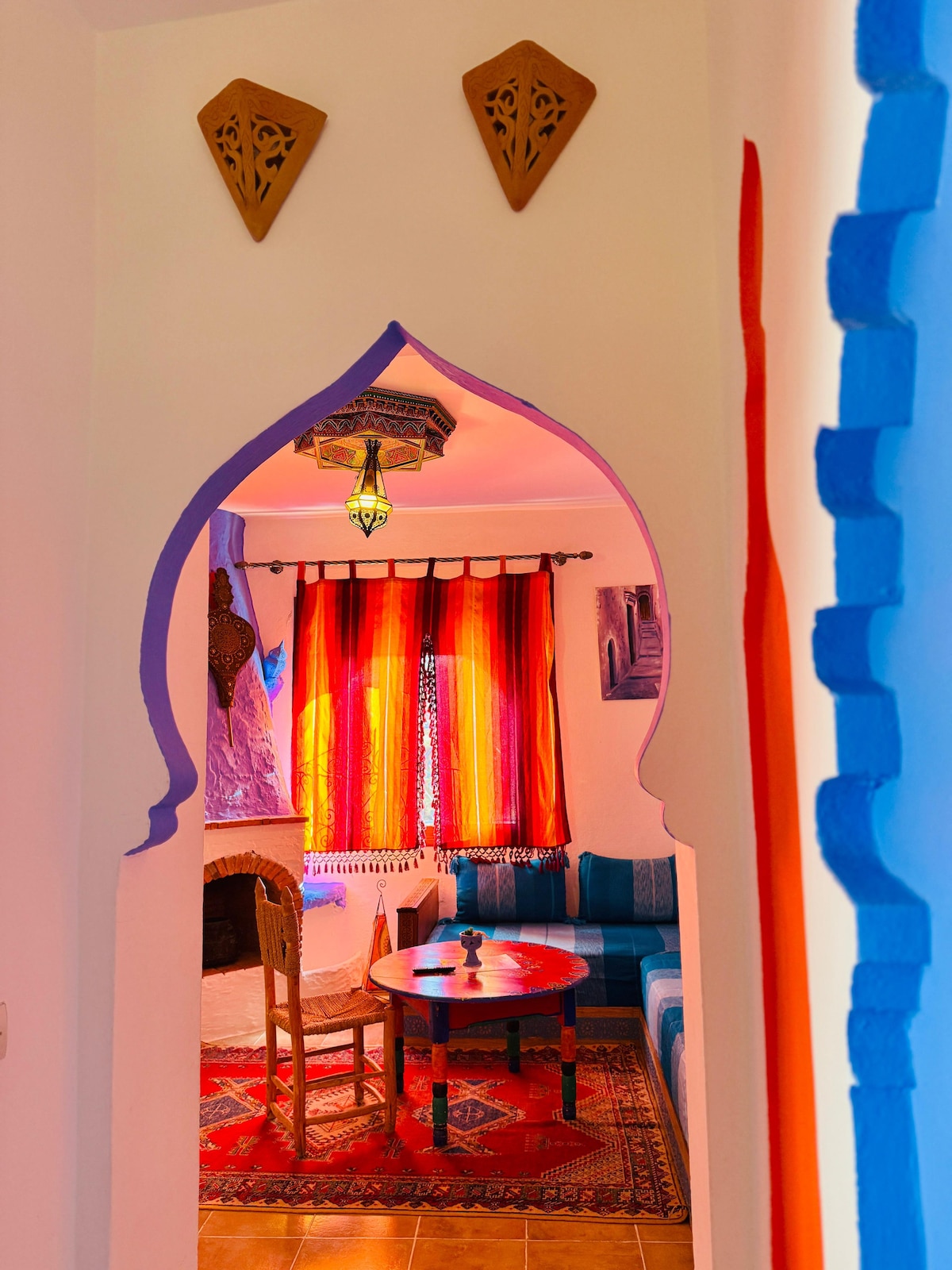 Découvrez cette maison atypique située dans la magnifique ville de Chefchaouen, connue par ses ruelles pittoresques et ses bâtiments aux teintes bleues envoûtantes. Cette maison unique et paisible vous charmera par sa proximité à Chefchaouen et en même temps à ses alentours sur des vues imprenables sur les montagnes du Rif. Les hôtes peuvent également vous proposer des plats traditionnels de la région et petits déjeuners à la demande.
