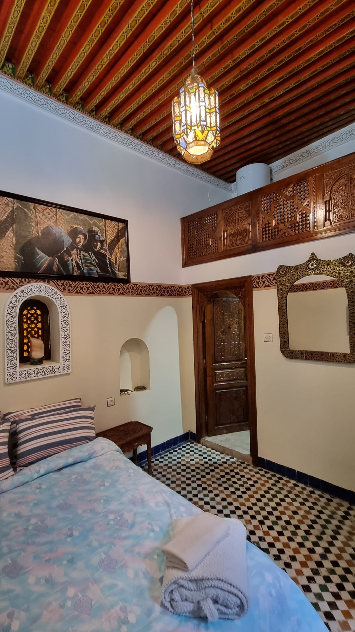 Masterfully blends timeless Moroccan style with modern design Located in the heart of the old Fez Medina. Offers an unparalleled experience. The expansive suite features a large bedroom, living room adorned with Moroccan mosaic private bathroom and air conditioning. Hand-picked furniture and exquisite fabrics create an atmosphere of elegance. Start your day with a delightful breakfast on your private terrace and enjoy ultimate peace and privacy. Experience the magic of Morocco like never before!
