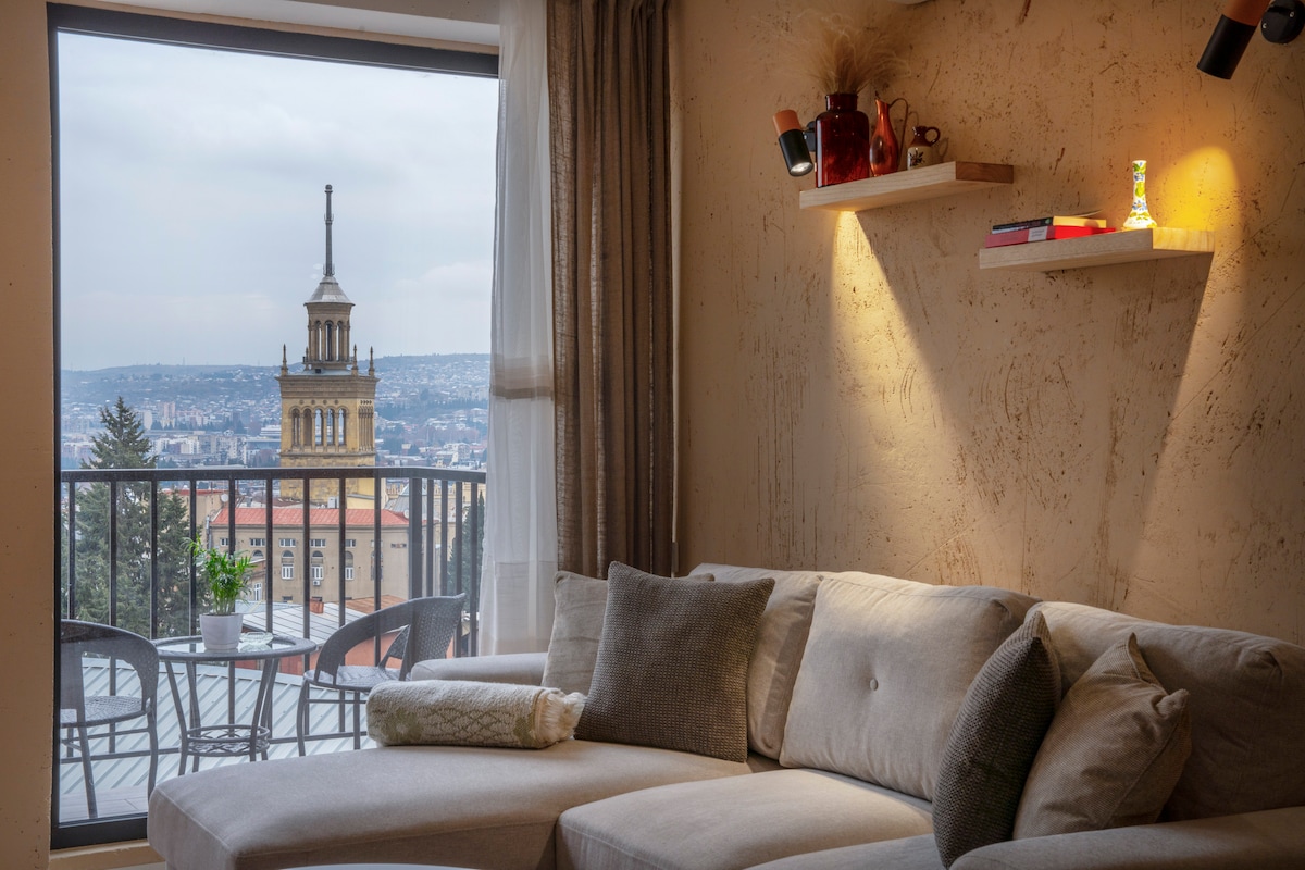 Explore the city from the most coveted address of Tbilisi! Enjoy the private terrace with fantastic views of all major landmarks: Opera★ Narikala Fortress★Sameba★Kazbegi mountains★ Feel the pulse of the main artery of Tbilisi, Rustaveli avenue. Located in a historic part, steps to Rustaveli avenue, opposite Marriott Hotel, in A-class building with reception, elevators, 24h security & cameras. Perfect for business/holiday travelers. Self check-in anytime!