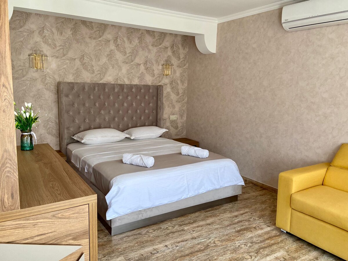 Новые комнаты гостиничного типа в самом центре города. С ванной. Есть маленький холодильник, чайник, фен. Нет кухни. Smart TV, fast Internet Можно пользоваться со стиральной машиной с сушилкой. Отсюда можете добраться пешком до все достопримечательные места Тбилиси. Вокруг много модных кафе ресторанов и бары, банки, супермаркеты, салоны красоты… на против замечательный Wine factory