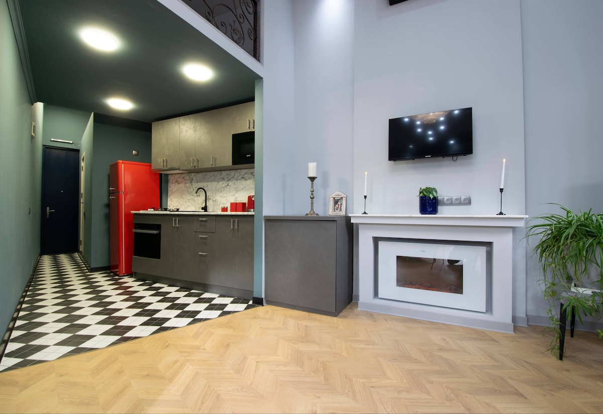 INDUSTRIAL Studio in old soviet building designed by "VIRSTAK", brings unique atmosphere with spectacular day and night CITY VIEW enjoyable from the BATHTUB. -100% HANDMADE. - Not a RANDOM cozy/ functional apartment, Studios amenities consists of old vintage and industrial furniture, for some people might feel uncomfortable out coming from a personal taste. Artistic vibe making you feel like in movies. - WINERY - 9 SORTS of wine - Movie Projector Airport pickup Suzuki Swift 80 Gel