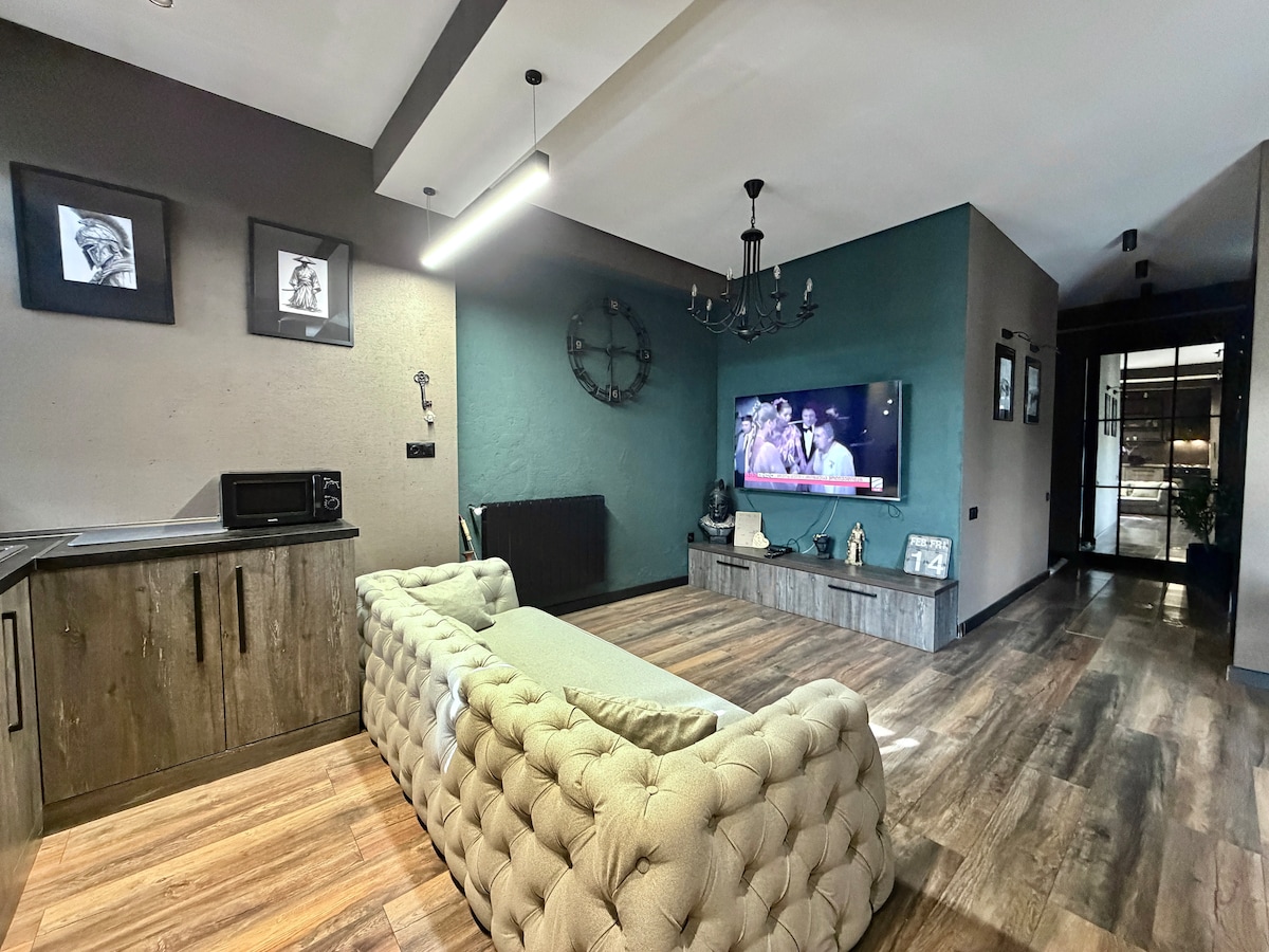 INDUSTRIAL Studio in old soviet building designed by "VIRSTAK", brings unique atmosphere with spectacular day and night CITY VIEW enjoyable from the BATHTUB. -100% HANDMADE. - Not a RANDOM cozy/ functional apartment, Studios amenities consists of old vintage and industrial furniture, for some people might feel uncomfortable out coming from a personal taste. Artistic vibe making you feel like in movies. - WINERY - 9 SORTS of wine - Movie Projector Airport pickup Suzuki Swift 80 Gel