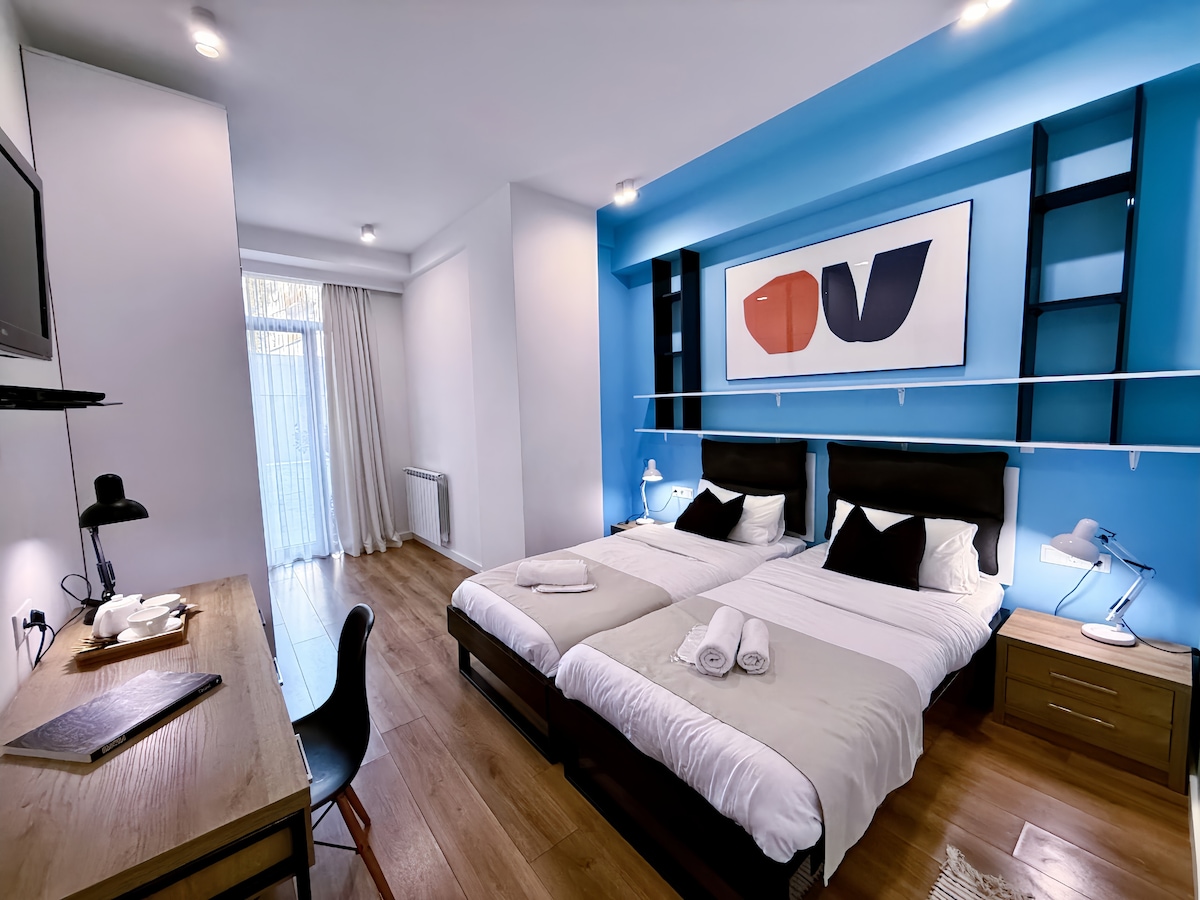 Deluxe — space, light, and the city at your feet Our finest room at Blue Balcony: a separate lounge area, a spacious balcony, and an open view of vibrant, living Tbilisi. A queen-size bed, interactive TV, safe, kettle, tea and coffee, robes, slippers, and a generous set of toiletries. And upon arrival, a glass of good wine. Just a little sign that you’ve come to the right place.