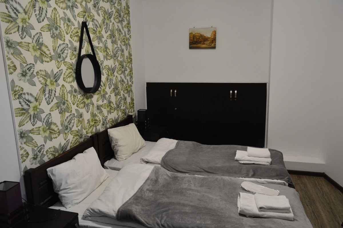 Bright room with two queen beds, ideal for small families or groups of four. Includes a private bathroom with a walk-in shower, free Wi-Fi, TV, safe, mini fridge, and an electric kettle with coffee and tea. Fresh towels, bed sheets, and toiletries provided. Shared kitchenette and co-working space available. This room faces the rear side of the building. Located in central Vake. Contactless check-in/out