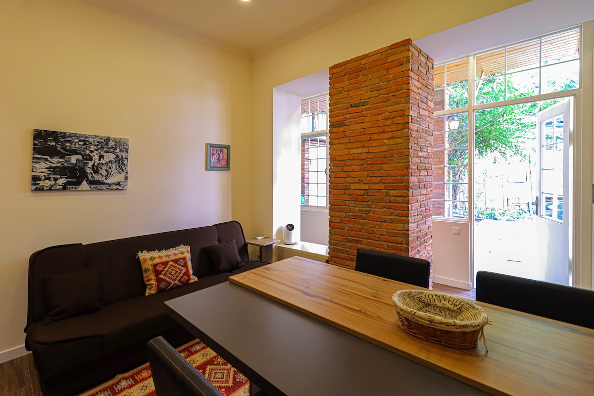 Charming Apartment in Tbilisi’s Old District Nestled in the heart of the city's historic district, this apartment offers a unique blend of old-world charm and modern comforts. Located in a historic building, the apartment sits within a cozy, quiet courtyard — the perfect escape from the city's hustle and bustle. Step out into the peaceful, plant-filled garden, complete with comfortable seating, a table, and a hammock. On a pleasant day, there’s truly no better spot to relax and unwind.