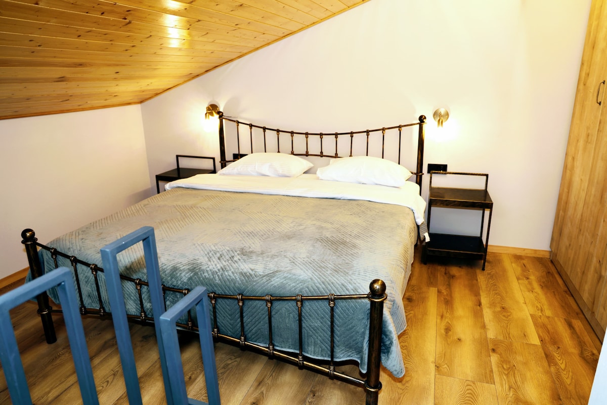 This amazing three-story house is centrally located, just a 15-25 minute walk from Holy Trinity Cathedral of Tbilisi, Avlabari metro station, Old Tbilisi, Maidan, and more. The house boasts exquisite interior design with decorative wallpapers from Dutch designers, mosaic tiles, and plants. You'll find all the amenities including appliances, furniture, and a smart TV for a comfortable stay. Special features include an infrared sauna and a spacious attic on the third floor with breathtaking views.