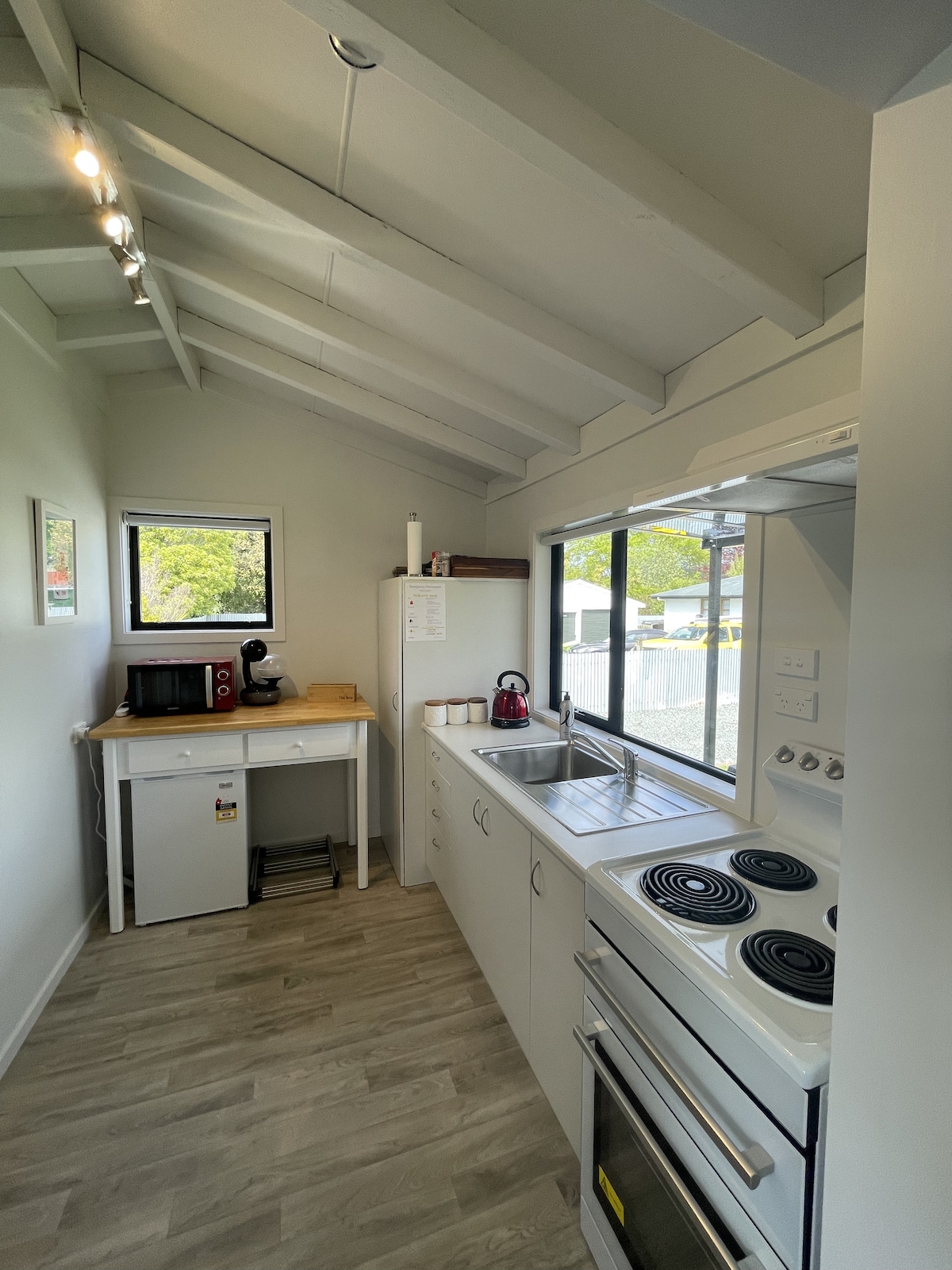 This peaceful, self contained cabin is surrounded by a sheltered backyard. It`s the most amazing feeling to open the window as you wake up, and hear the birds in the large Fiordland Beech tree while the sun streams past the curtains.