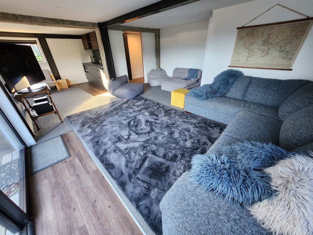Downstairs apartment of a luxury home, right on the Lakefront in Te Anau, directly across from the boat ramp. 2x Super King beds, well equipped kitchenette with cooktop. Please note: the ceiling is lower than standard - get in touch if you need measurements! Parking available on the street directly across the road. Sliding door private access shown in full house photo to the bottom left. A peaceful getaway close to everything!