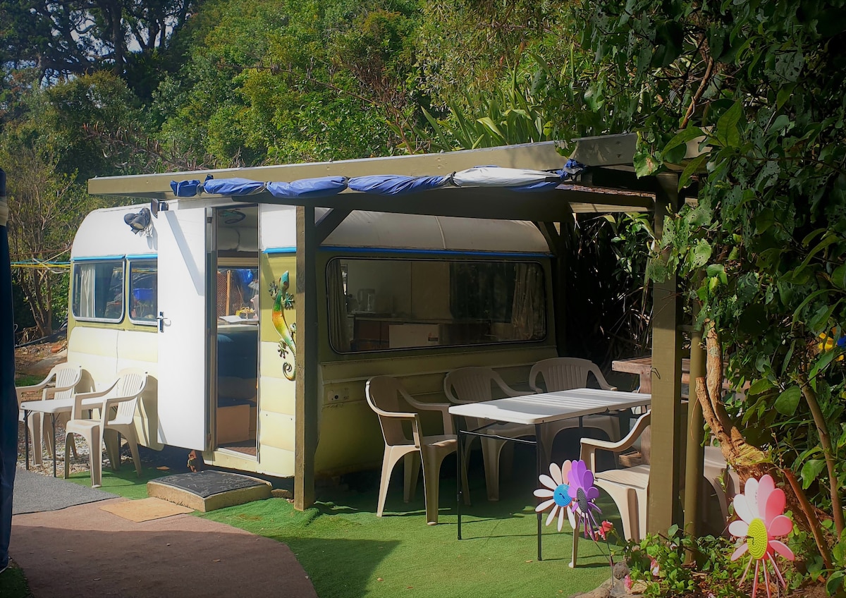 On a quiet small lifestile block the recently restored caravan is facing northeast with a view to mountains and sea. Collingwood and the beach is only 1 min away. Wharariki Beach and Farewell Spit about15 min. A small fully equiped kitchen, a seperate bedroom and spacious seating area awaits you inside. Your private Bathroom and Toilet is about 20m away in the main house. You can enjoy the peaceful setting in a way like camping used to be 40 years ago.