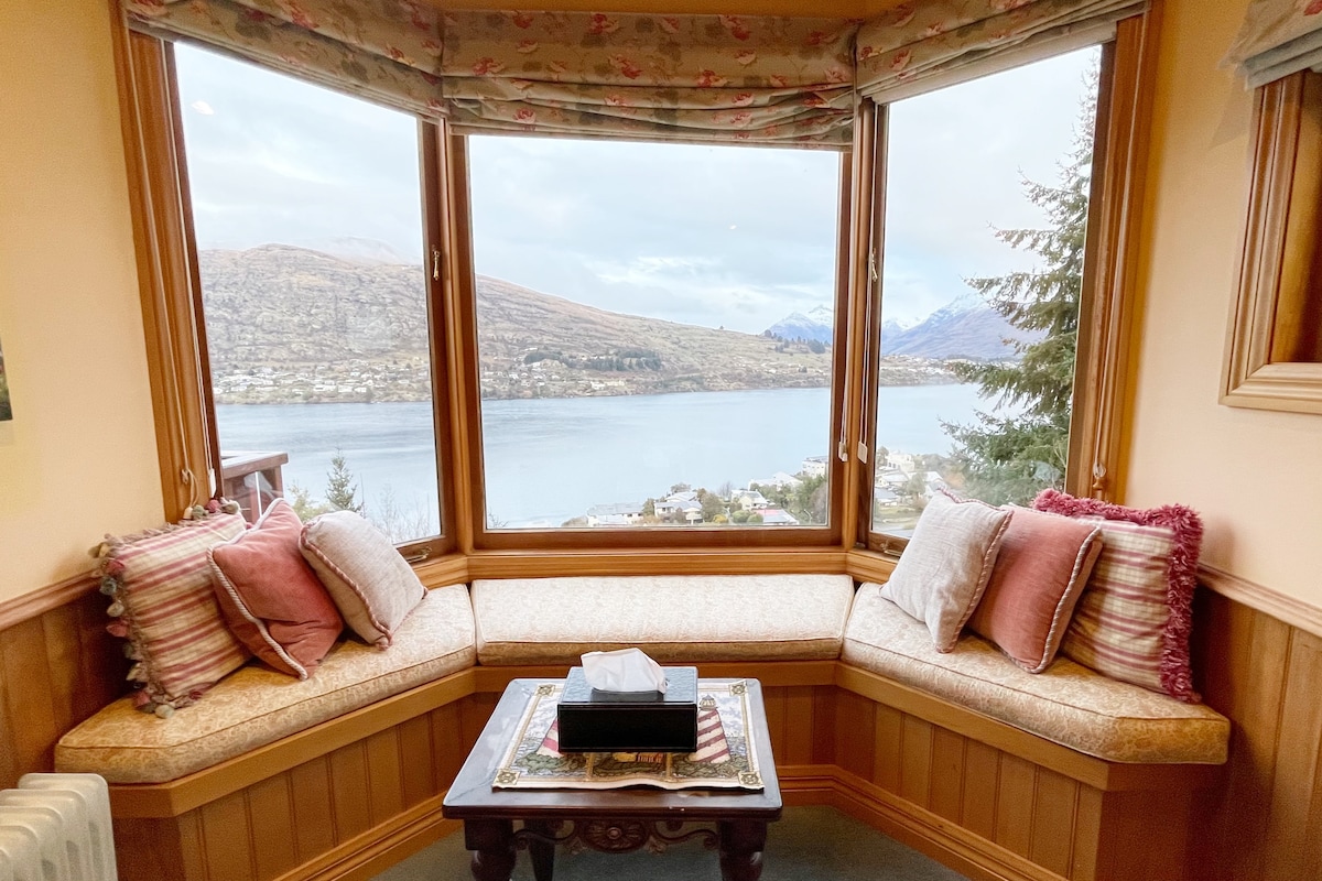 The Southern Cross is bright and cheery with a bit or a botanical feel. Lie in bed and watch the sun set on the Remarkables. With private balcony and half turret sitting room with window seating you can feel very at one with nature. It is a perfect spot to sit and watch the native Bellbirds and Tuis. There are stunning views of everything from The Remarkables, Lake Wakatipu, Cecil and Walter Peak. Freshly snow capped on a cold morning, Cecil will speak to your soul.