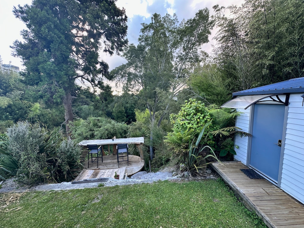 A great location near Waikato Hospital, Hamilton Lake, Hamilton Gardens and the city centre. Green Valley Cabin overlooks a gully with nature right on your doorstep. You may even be greeted by our delightful and friendly one-eyed cat, Winky. This is a self-contained unit with a toilet and shower. Please note no kitchen or cooking facilities, however, there is a fridge and microwave.