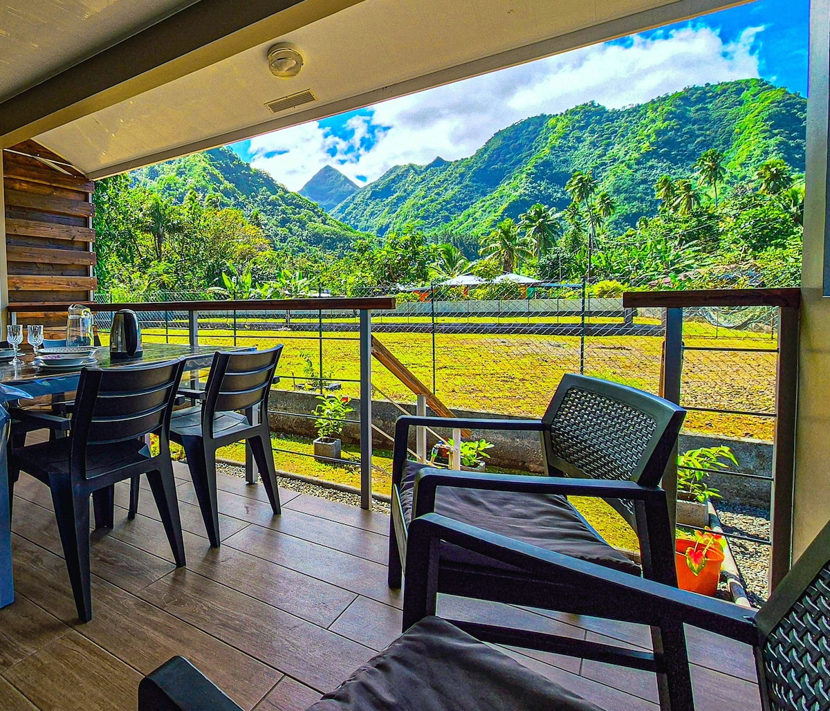 Détendez-vous dans ce cottage tropical, en montagne, à 500 m d'altitude, à 30 mn de l'aéroport, avec une vue unique à Tahiti sur le lagon et Moorea, dans une résidence très calme 2 chambres climatisées, avec 2 télévisons, internet, pour 5 personnes avec soit 2 lits king size et 1 lit simple ou 1 king size et 3 lits simples. Deck, piscine, BBQ Cuisine avec lave vaisselle, micro-onde, bar, four, cuisinière à gaz 1 Salle de bain, sèche cheveux, lave linge+sèche linge, fer à repasser