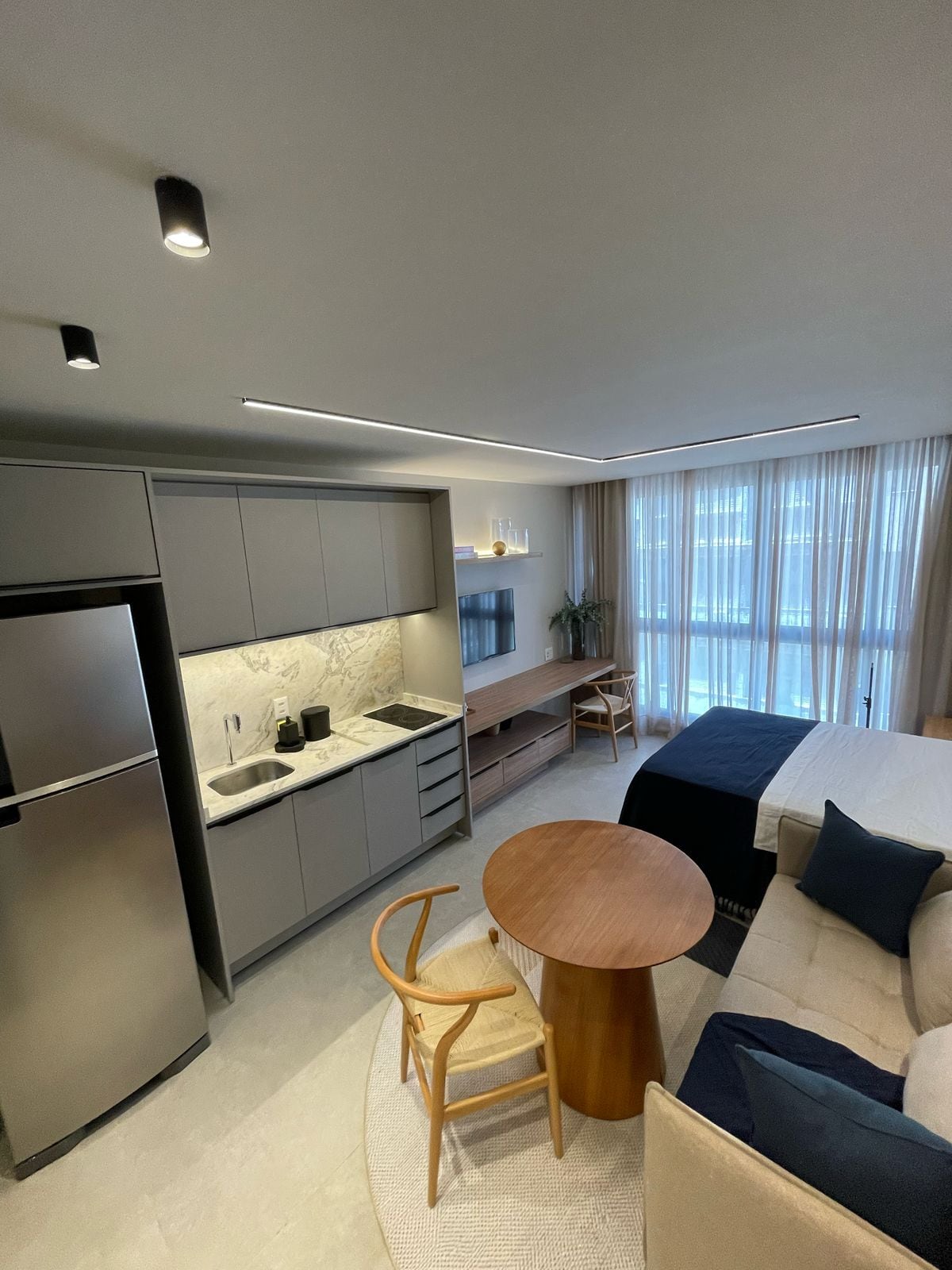 Lovely apartment with stunning ocean views, overlooking Salvador's main landmarks. From the balcony, besides the beautiful view of the All Saints Bay, you can admire the Bahia Marina, the Lacerda Elevator, the Solar do Unhão, and the São Marcelo Fort. The space is elegantly decorated, with environments equipped with everything you need, including a balcony with magnificent views. The bedroom features a comfortable queen-size bed, while the living room has a double sofa bed.