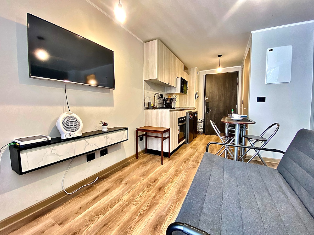 Departamento completo en Santiago Centro, equipado con aire acondicionado (frio/calor) desde septiembre 2025. Seguridad 24/7. A 3 min caminando del metro Parque Almagro y el Teatro Caupolicán. Está a sólo 7 cuadras de la Alameda y Centro Cultural La Moneda. Es el lugar ideal para personas que quieran ir a eventos en el Caupolicán o para hacer turismo en la ciudad. El departamento tiene 2 ambientes, living-cocina y un dormitorio. Adicionalmente tiene una pequeña terraza ideal para fumadores.