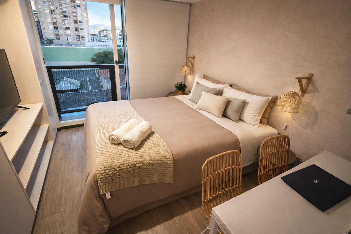 This apartment is ideal for relaxing and enjoying the city. It's centrally located, between the Santiago Centro and Providencia districts, one of the best locations in the city. It offers beautiful views of San Cristóbal Hill and the Sky Costanera. It's just a 3-minute walk from the metro and buses. Includes: Free Wi-Fi, a fully equipped kitchen, sheets and towels included, a large bed with a large Smart TV. Self-service entrance with a key, allowing you to arrive at any time.