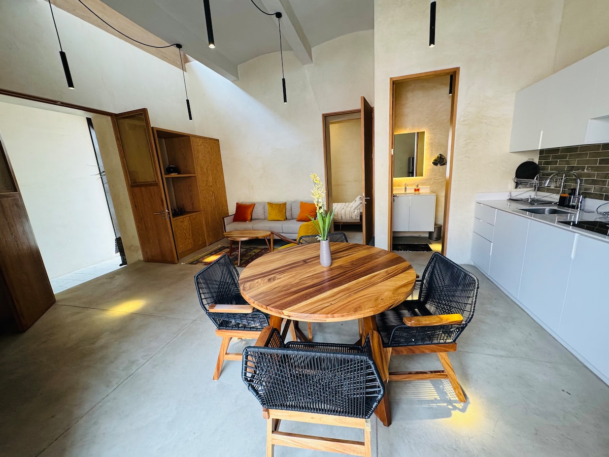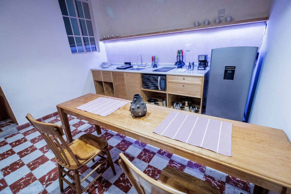 Dulce departamento tipo loft con arquitectura oaxaqueña contemporánea. El apartamento está ubicado a sólo 3 cuadras de la plaza principal llamada Zócalo y 3 cuadras del templo de Santo Domingo de Guzman. A pasos de famosos restaurantes multi premiados, galerías de arte, cafés y el bello andador turístico de la ciudad. Desde aquí podrás llegar andando fácilmente a todos los atractivos que te ofrece el centro de la ciudad.