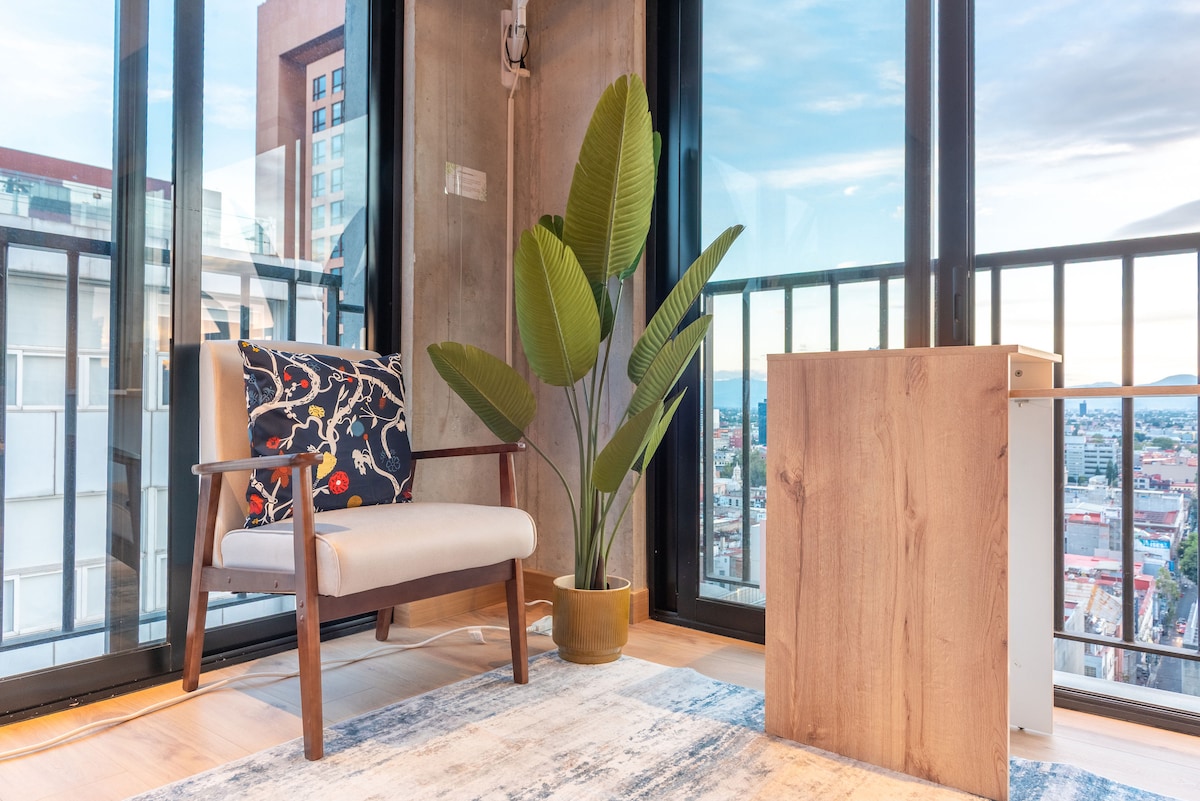 Extraordinary 1-bdr apartment, a gem on the 22nd floor. Begin your day sipping coffee & soaking in the city's rich history from the unique panoramic terrace with an unrivaled view of the iconic Monumento a la Revolución. Designed by architect Alberto Kalach, a minimalistic space with vintage touches for added charm. Located on Reforma Ave. Ideal for couples & entrepreneurs seeking distinction and inspiration.
