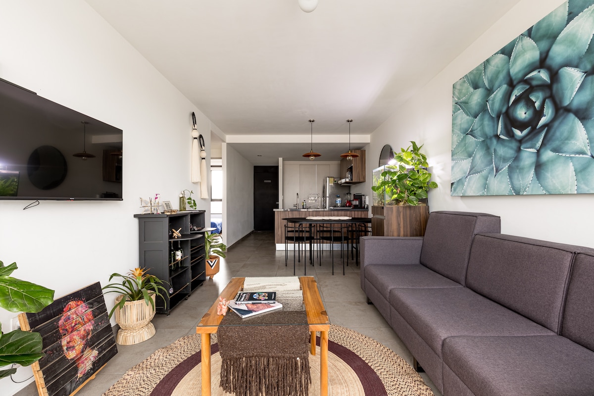 Desertic Chic CDMX公寓,可爱阳台和电视投影仪
