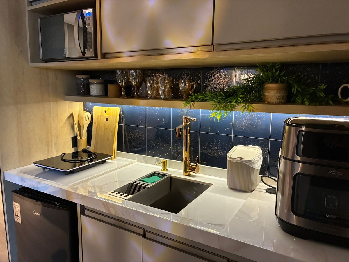Equipado e com cheirinho de novo. O apê é num prédio recém construído, e tem garden, telhado estiloso, 2 TVs 42” e sofá confortável. De Miojo a risoto, dá pra fazer tudo, com cooktop, air fryer, microondas. Home office? Tem Vivo Fibra e máquina DGusto. Quer curtir? Netflix, Max,Prime e Google Home. Ainda tem academia e piscina no rooftop. Precisa sair? Paulista a 5 min, com pontos de metrô perto. Vai voltar? A portaria é 24h, a fechadura com senha. E o melhor: a internet funciona no banheiro.