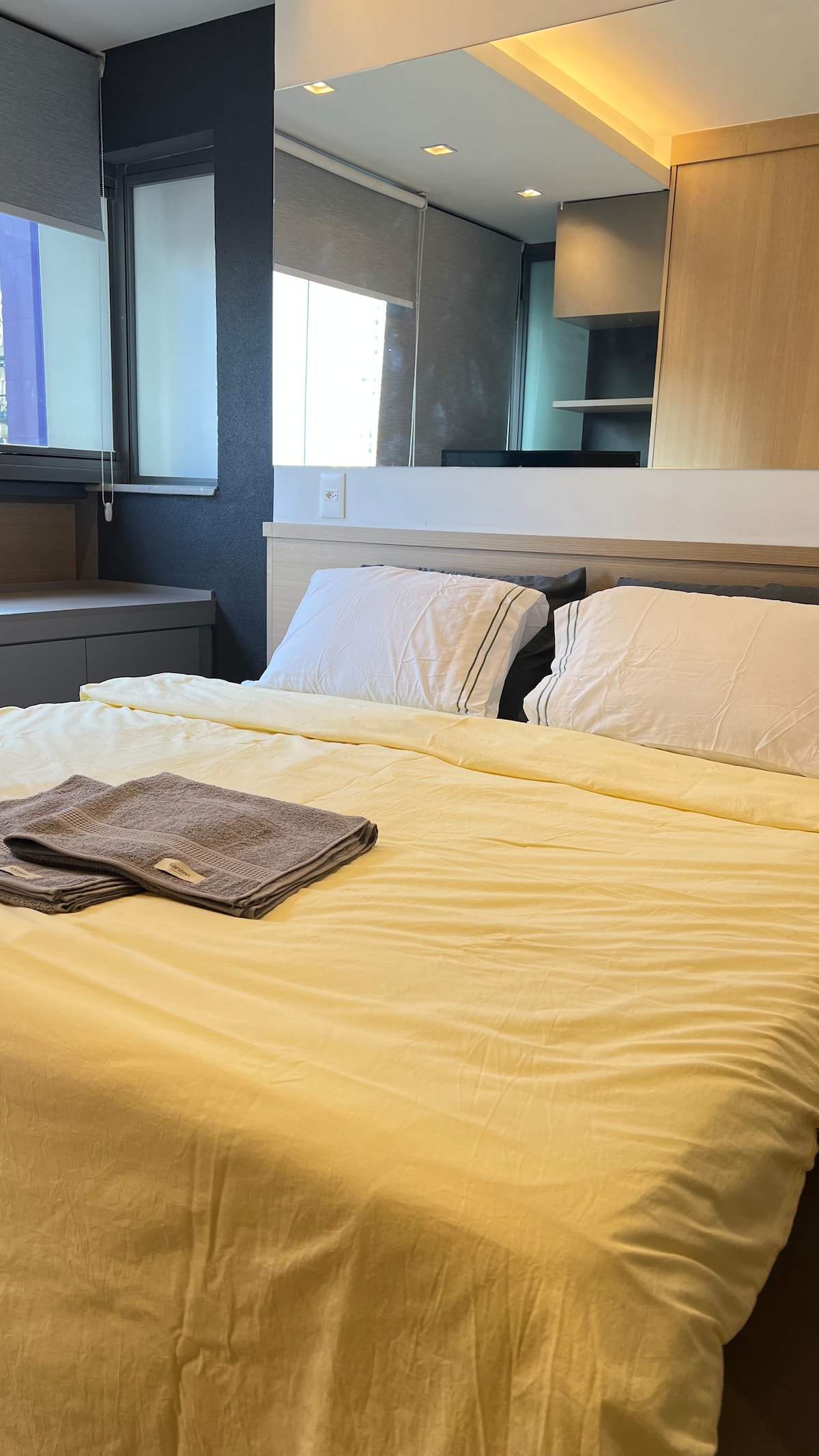 No 15º andar oferece vista livre e deslumbrante Fácil acesso ao metrô e comércio essencial: mercado 24h; restaurantes; farmácias; cafeterias, etc. Condomínio: • Academia • Piscina aberta e piscina semiolímpica aquecida • Sala de spa • Salão de jogos • Salão de festas • Churrasqueira • Área pet • Bicicletário • 2 vagas de garagem O estúdio: • Cama queen + sofá cama para visitas • Guarda-roupa com espelhos • Ar-condicionado • Cooktop • Televisão retrátil • Chuveiro a gás