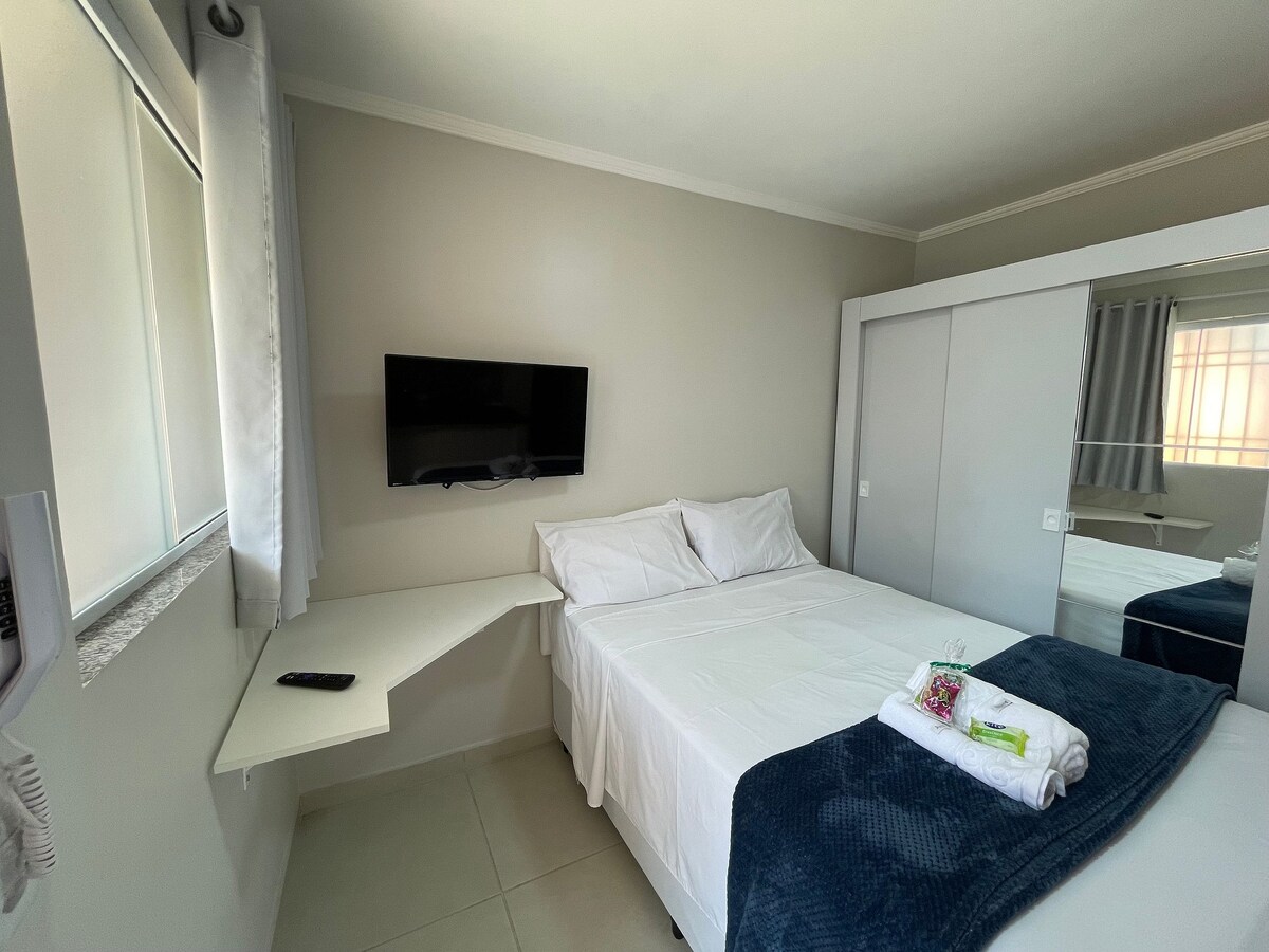 *** Hospedagem somente para 1 pessoa *** Relaxe neste espaço calmo e cheio de estilo. cama-box casal, ar-condicionado Quente/Frio e máquina de lavar. - Internet Vivo fibra (300Mb). - Cozinha privativa com geladeira frost- free,fogão,microondas, cafeteira Nespresso, e utensílios domésticos. - mesa para home-office. - TV Samsung Smart 4K - 43”. - troca de roupa de cama e banho 1x/semana. - área externa compartilhada com outro hóspede ( academia e jardim )