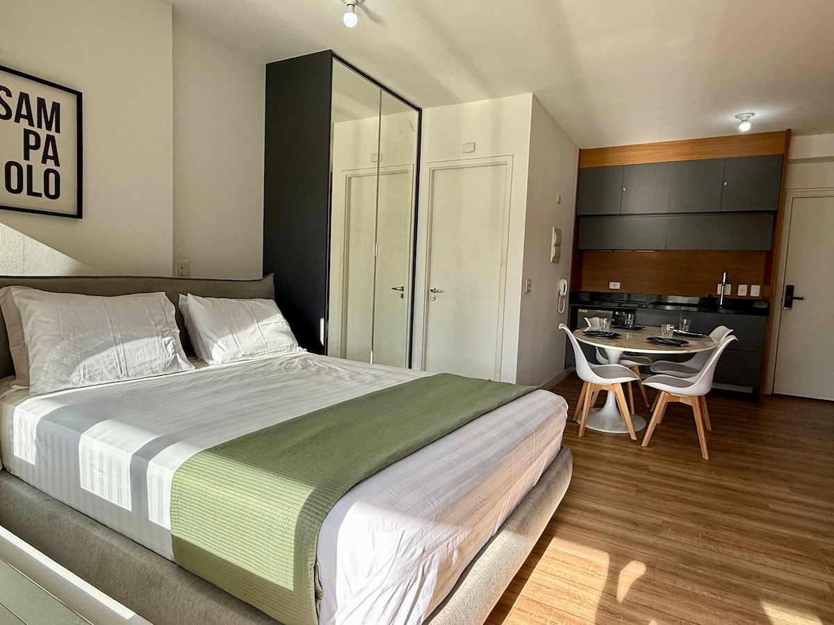 A unique space. Have a true Paulistana experience! Flat with 44m2, 1 bedroom with double bed (noise-resistant window), living room with 65p TV, Wifi, kitchen, new and renovated apartment, balcony, free parking, close to several shopping centers, convenience stores, fantastic restaurantes, in the coolest and most famous neighborhood of São Paulo, close to Subway (400 meters) , beautiful view of Av Paulista. Accommodates up to 3 people (1p in the living room sofa-bed). 24h reception desk.
