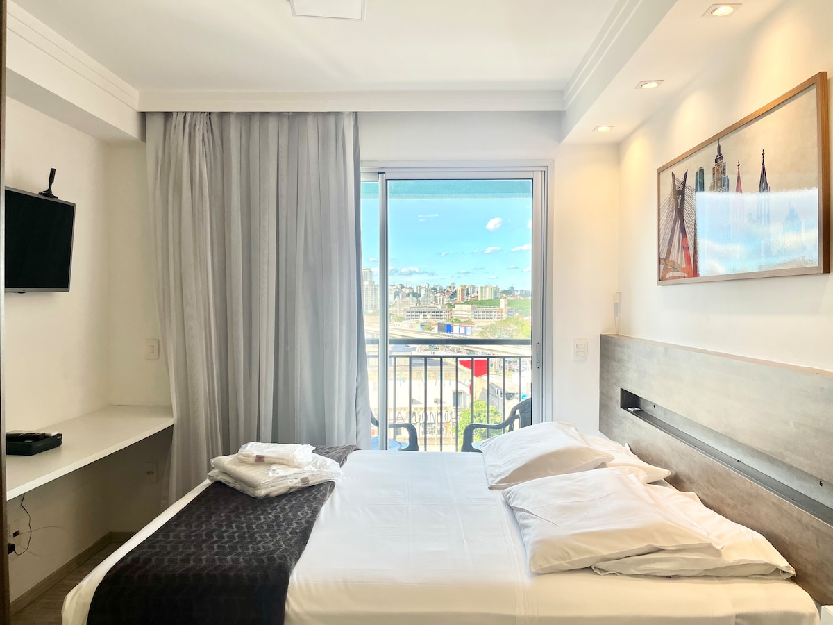 Flat with mini-kitchen in the best location in São Paulo, one block from Av. Paulista, 450m from Trianon Masp station. High-speed Internet in the apartment itself (besides the hotel internet) and a good place to work. Beautiful 65 INCH TV. 1 King Size bed OR 2 Single beds, just let us know. It is in a 4-star hotel with an excellent gym and sauna included in the rate. With iron and ironing board. A garage included. - 2 restaurants, one on the rooftop (terrace), with a beautiful view of the city.