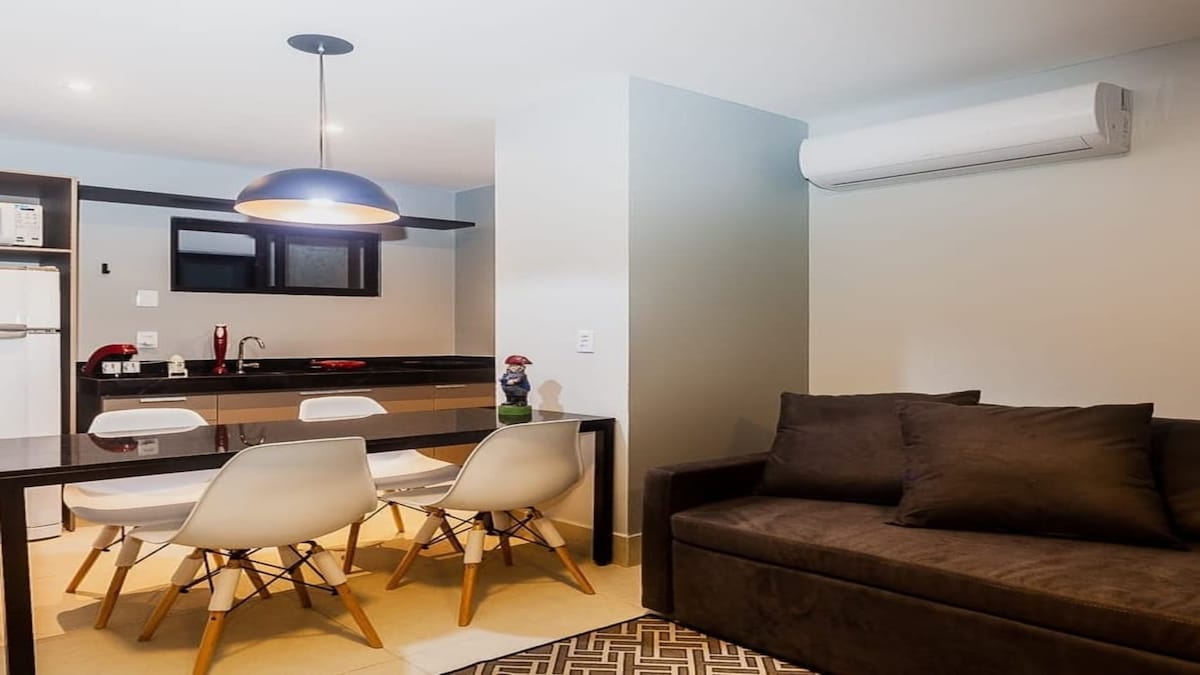 Flat de 25m2 super moderno e aconchegante em um dos endereços mais centrais e privilegiados da cidade. Desfrute da cidade sol em um flat climatizado com quarto com cama queen, mini sala com smart tv e cozinha completa. Todo o ambiente possui wifi e conforto. Dispomos de toalha e roupa de cama e nosso condomínio conta com recepção e segurança 24hs.