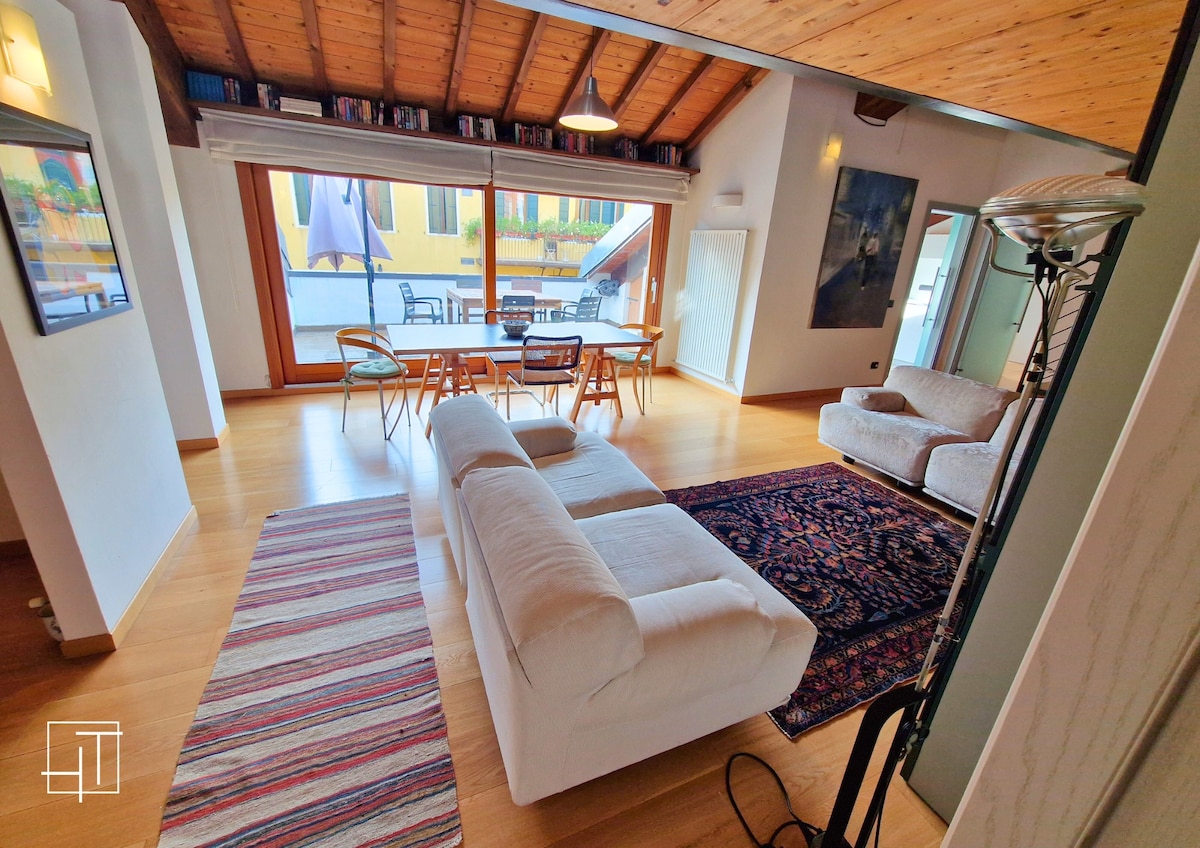 Magnificent accommodation with high-quality finishes located in the historic Piazza delle Erbe. The flat consists of: - Open-plan living room with dining table and sofas - Modern, fully equipped kitchen - Relaxation area with sofa and TV - Mezzanine with study desk - 2 bathrooms, one with glass shower cubicle and one with bathtub - 2 double bedrooms with queen-size beds - 1 double bedroom with king-size bed. The flat is only 30 minutes by train from Venice.