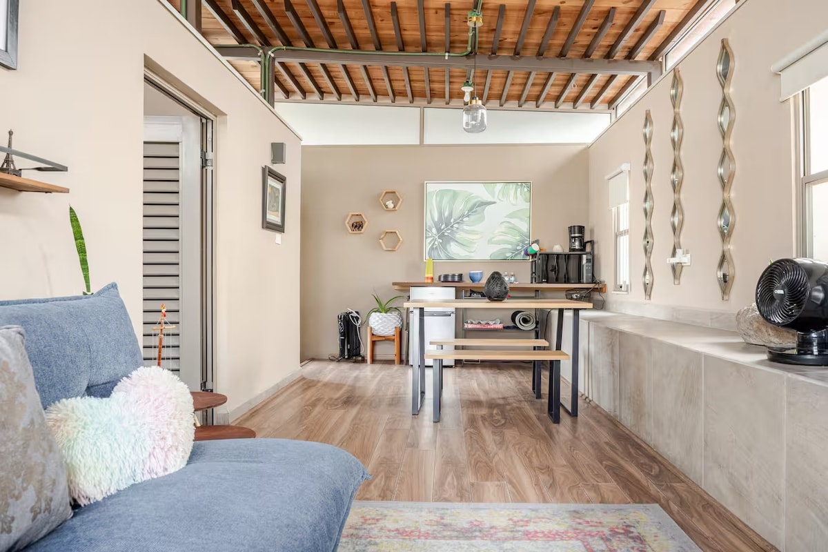 Alojamiento completo ideal para familias o grupos, ubicado en la parte alta de la casa con acceso independiente y total privacidad. Cuenta con dos recámaras, sala con sofá cama, cocineta equipada, aire acondicionado y espacios cómodos para descansar. Su diseño cálido con techos altos y luz natural crea un ambiente acogedor y elegante. Perfecto para disfrutar Monterrey con comodidad, tranquilidad y amplitud.