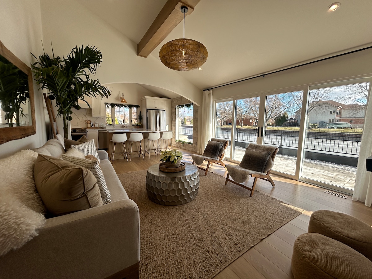 Waterfront Modern Executive Cottage with lots of natural light and stunning views. This cottage is a breath of fresh air and provides all of the comforts and conveniences that you need in a luxurious relaxing getaway . The cottage boasts a unique layout that sleeps 4 with a bright fully stocked kitchen and dinette, master bedroom, an eclectic second bedroom, barn doors, Smart TV and plenty of closet space, gas fireplace, swimming pool and giant waterfront backyard with lake access to swim.
