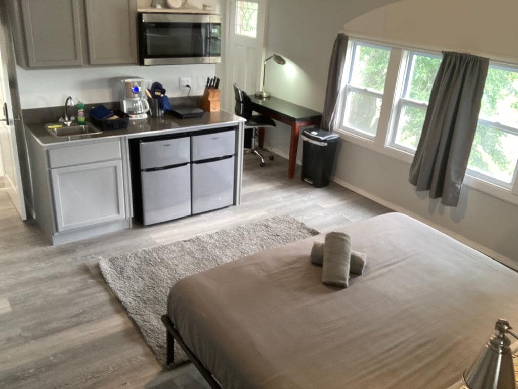 A dream for any business traveler! This studio caters to anyone who needs space, a place to relax and access to all the local needs. The main room hosts an open floorplan with a queen bed, a sleek living area that has a 55" TV and a cozy dining/office area. Barn style doors leads to a modernized full bath and shower with alcove style tub. The kitchen has all the amenities you could need, including a basin style sink with a modern pull down faucet, dishware and silverware.