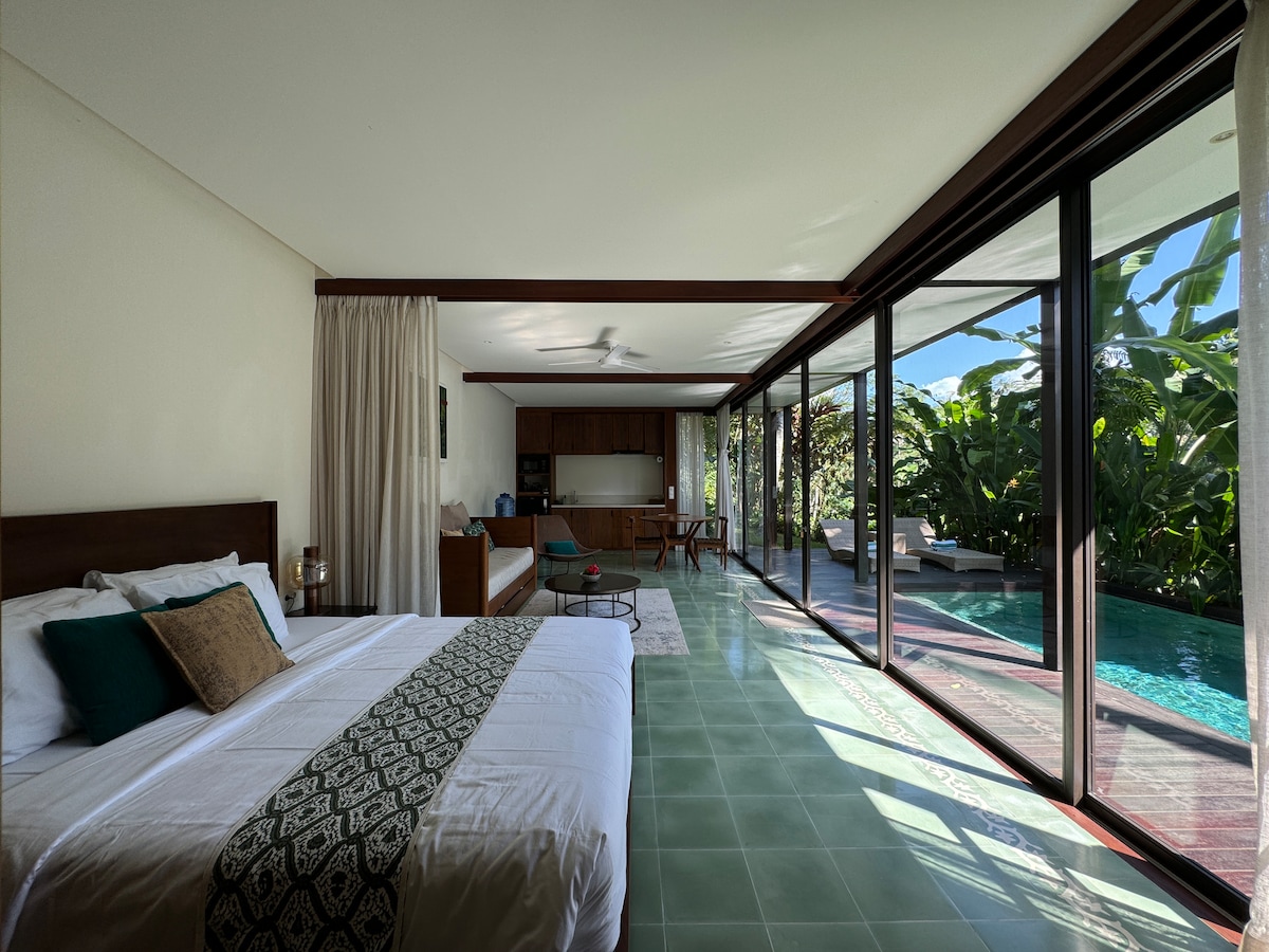 Welcome to iNYa! Our cozy, bright room offers privacy and tranquility, nestled at the back of a beautiful house compound with a large garden and stunning views of rice fields and a serene valley. Enjoy your own private pool for a refreshing dip in peaceful surroundings. The comfortable, well-appointed room provides a restful stay, and the open-plan kitchen and living area are perfect for cooking, dining, and unwinding.
