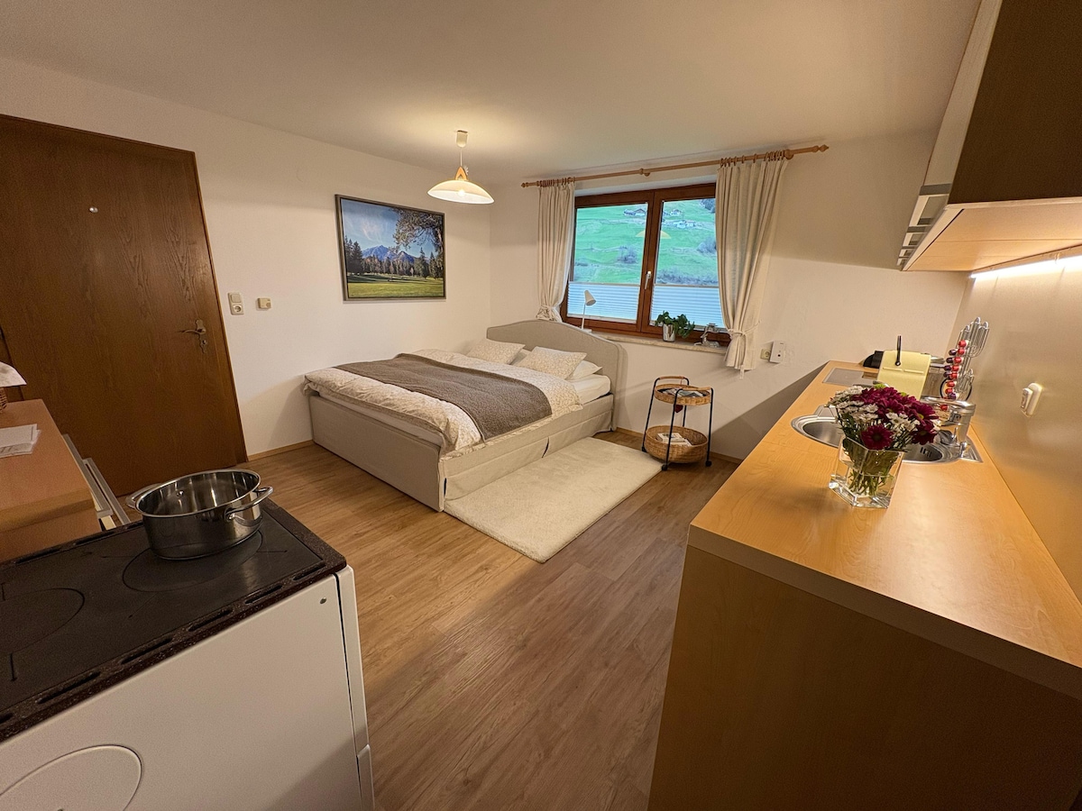 Situated on the outskirts of a Tyrolian mountain village this place offers you a wonderful-broad view. The apartment, lovingly combining tradition and modernity will let you calm down and recharge your batteries instantly. A closeby cable car enables you to all kinds of mountain sports in summer and winter. Yet- even those, who just "stay and relax" will feel at home. WIFI, TV, BT-boxes, parking space are available free of charge; for the Sauna we take a small feey. Kitchen is well equipped .