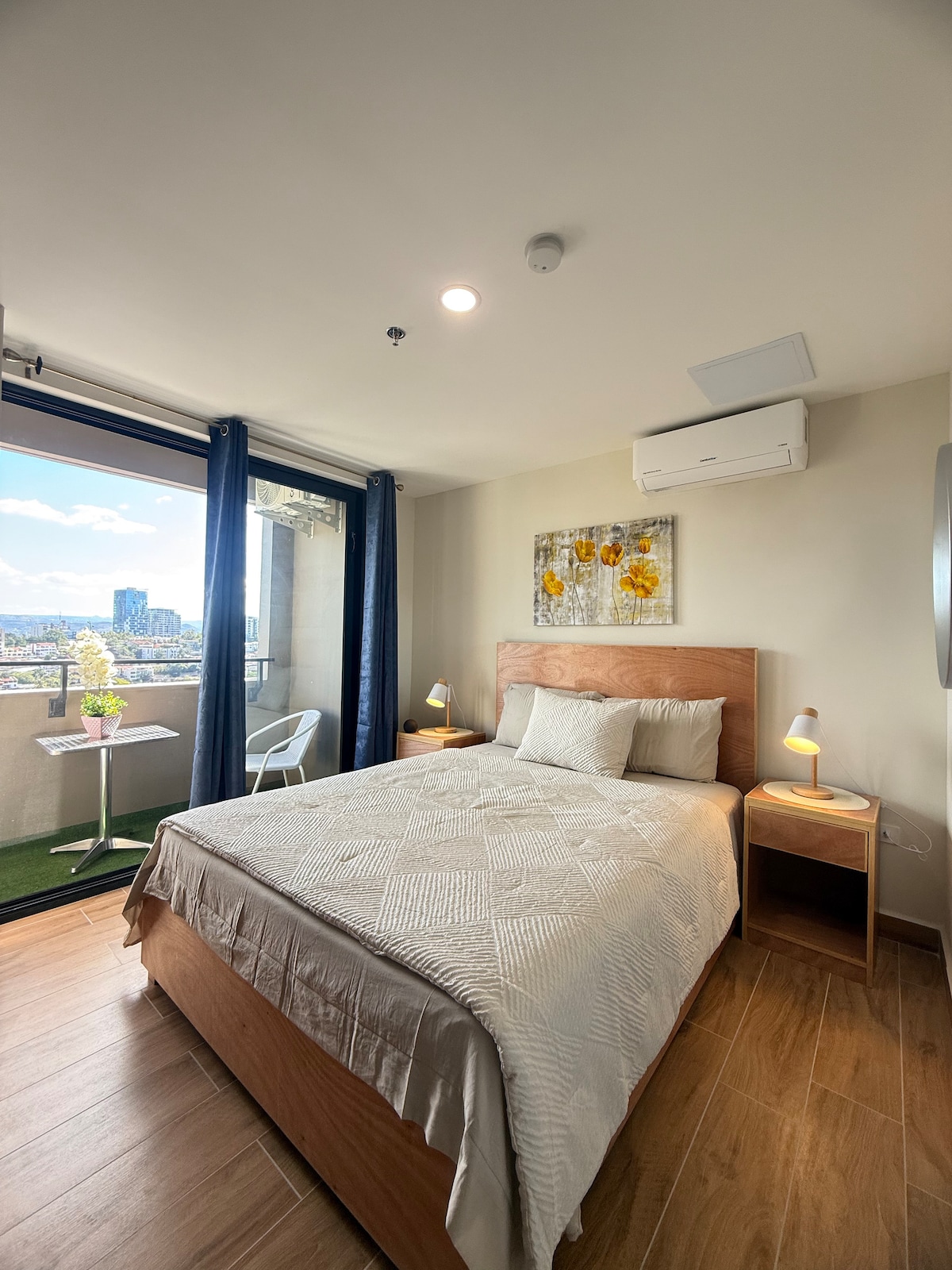 Disfruta de una vista relajante desde las alturas mientras te rodeas de un ambiente tranquilo, limpio y funcional, pensado para que descanses como mereces. Perfecto para estancias de trabajo, escapadas en pareja o viajes por la ciudad. Este moderno apartamento en el piso 15 de la Torre Sur, en Distrito Artemisa, cuenta con cama King, cocina equipada, baño privado, aire acondicionado, WiFi, Smart TV, lavandería, ascensor y seguridad 24/7.