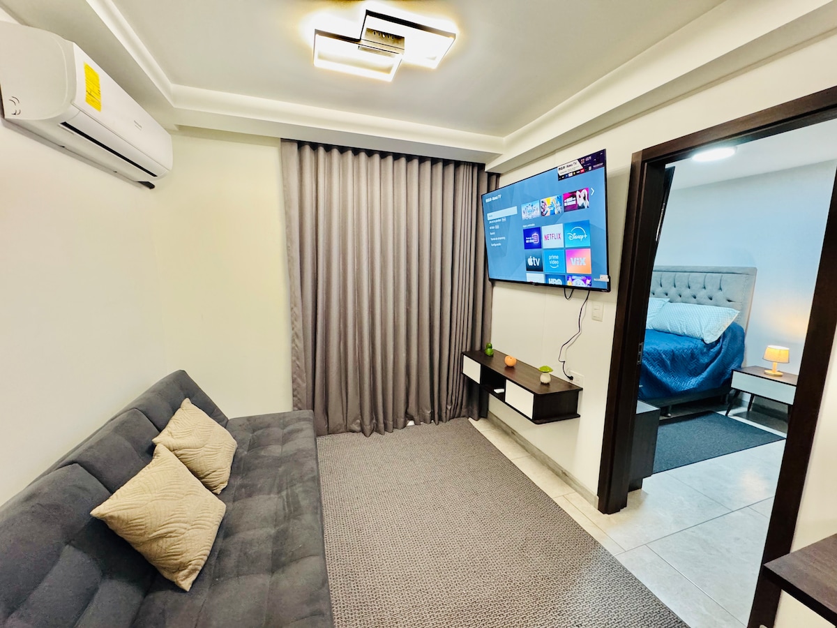 ¡Bienvenido a tu nuevo hogar! Encantador apartamento de una habitacion amplia con walking closet, sala, comedor y baño. La sala es perfecta para relajarse en un sofá cómodo y TV. Cocina completamente equipada. Disfruta la comodidad de lavadora/secadora. Ubicación privilegiada y muy segura. Atrás de la EMBAJADA AMERICANA. Disfrute gratis en la terraza del piso 24 piscina, jacuzzi, área de juegos infantiles Centro comercial en el edificio con restaurantes y muchas tiendas para tus compras.