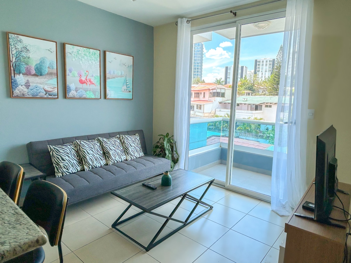 • Luxurious and secure apartment • 15 min from the U.S. Embassy • 2 bedrooms, each with a private bathroom, blackout curtains, and A/C • Fully equipped kitchen • Free washer and dryer • 3 Smart TVs with Netflix • Furnished terrace + complimentary coffee • Walking distance to Multiplaza, banks, and restaurants • Ideal for 4 guests (up to 5 with the sofa) • Pet-friendly • Pool available for stays of 10+ nights, according to the building’s internal regulations