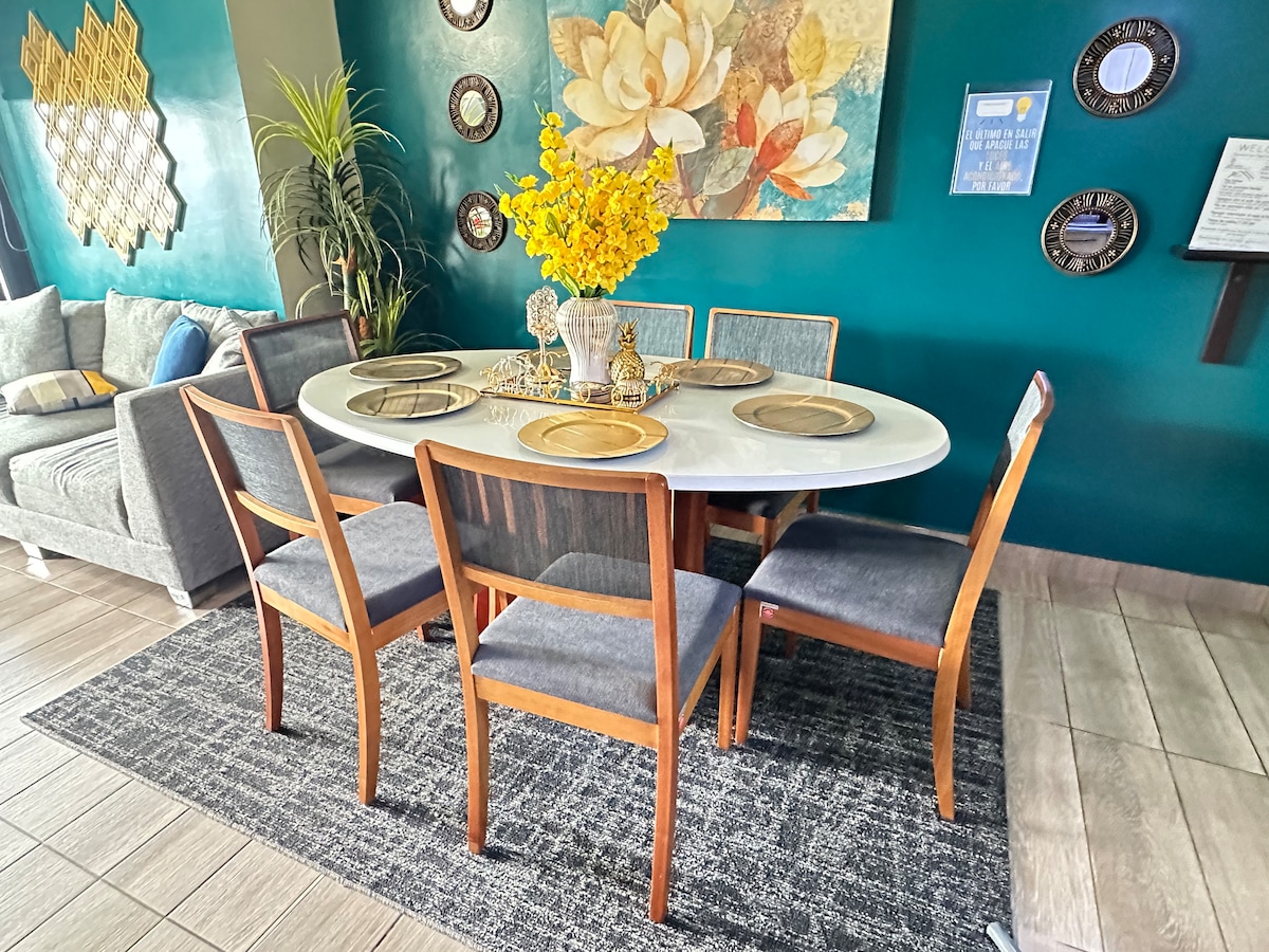 • Furnished terrace + complimentary coffee to unwind • Luxurious and safe apartment • 15 minutes from the U.S. Embassy • 2 bedrooms, each with a private bathroom, blackout curtains, and A/C • Fully equipped kitchen • Free washer and dryer • 3 Smart TVs with Netflix • Ideal location: walk to Multiplaza Mall, banks, and restaurants • Perfect for 4 guests (up to 5: 1 on the sofa) • Pets welcome!