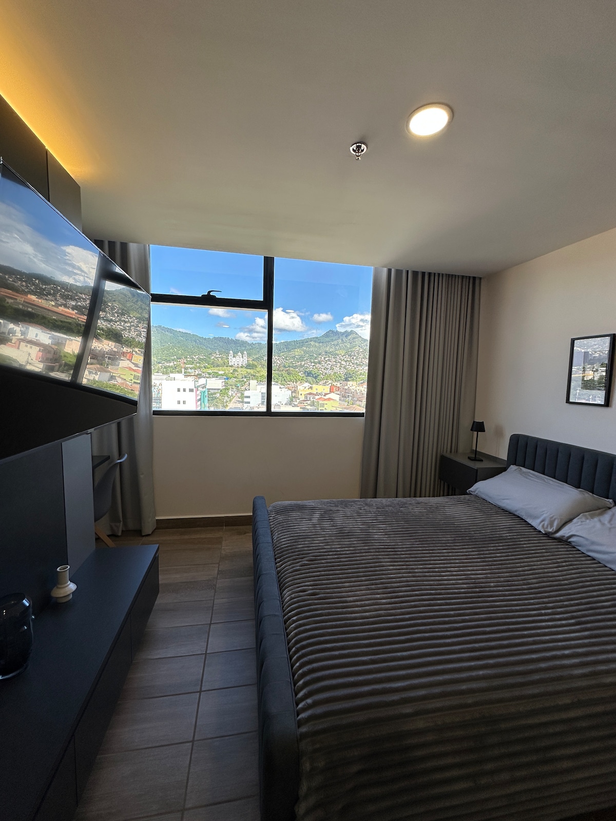 Ubicado en la zona más exclusiva de la capital de Honduras, cuenta con vista panorámica de la ciudad. Disfruta de una visita memorable desde el último piso de este exclusivo edificio. Cuenta con seguridad las 24 horas y estacionamiento privado sin costo. Ya sea que tu viaje sea de negocios o placer disfrutarás una excelente estadía. Amenidades: Smart TV 60” en sala. Smart TV 50” habitación principal Aire acondicionado sala Aire acondicionado habitación 1 Aire acondicionado habitación 2 Balcón